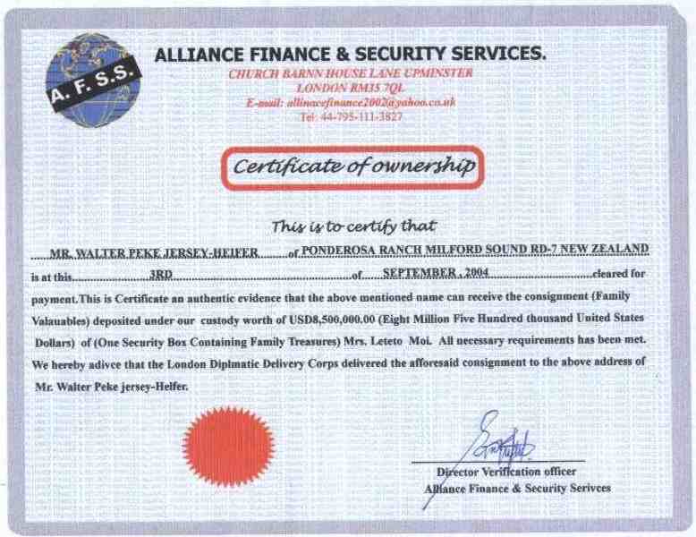 a new Certificate of Ownership that will enable you collect the Fund from the