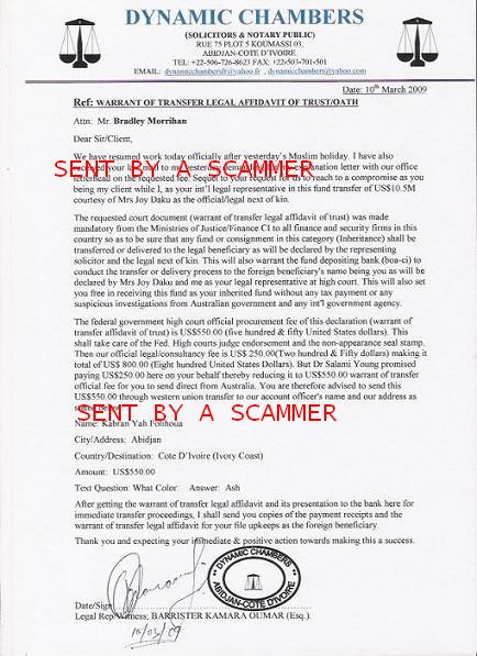 I have a qeustoin abuot this. "You are also required to procure A Legal Affidavit of Trust (Warrant of Transfer Declaration) from the Federal Ministry of Justice Cote D'Ivoire through a resident lawyer here to enable us carry out the transfer process on your name. This will be attached with this fund transfer payment slip enrooting to your account. So as to free you from paying any tax or answering any question on how and where you got the fund." Deosn't Australain law take care of that bit? Bradley Morrihan Bradley Morrihan