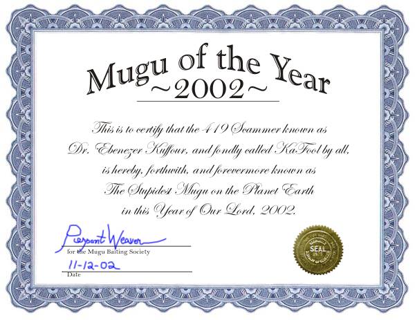 Dr. Ebenezer Kuffour KaFool makes a feeble attempt to revise the deal. My friend if you believe your self or you dont believe an existing company then let it be so. You can come to our office even through the documents sent to you. froud stars do not have company registration or and address to locate him. Verify the genueinty of the company and their products. Pierpont Pierpont slaps KaFool around some more, and then passes on letter where the "Head Chemist" of Weaver Enterprises also gets in some insults Dear KaFool, Oh, you silver tongues devil. You certainly have a way with words. Given the convincing spiel you always lay down I'll bet you could sell just about anything! Your last letter soooo messmerised me that I almost believe you DO have a company. Uhh... notice I said almost. To 100% convince me you'll have to DHL me another package of alluvial gold. Or just wire me some cash. Then you'll have access to my millions of US dollars. Honest. Ha-ha. Just kidding. I would feel real, real, real, real terrible if you had to mortgage your families prize water-buffalo to send me more money. However, that is the idea behind the 419 scam isn't it? Sucker them out of some money, and then sucker them out of some more as they try to recoup their losses? Who gives a shit how much financial pain it causes them? Anyhoo... my head chemist wanted to pass on a letter to you also. I've included it below. Hey Stupid Dipshit Mugu, This is "Roger Z. Naberhood", aka "John Smith". The first thing I want to say to you, is thank you for sending us gold, you STUPID ass. You are quite possible the STUPIDEST person walking the face of the Earth. You are STUPIDER than a fucking cow. You are goat's ass STUPID. Can you even tie your own shoes? Did your mommy drop you when you were a baby? Whatever you do, don't have children. They would be STUPIDER than you, and that is something no human being should have to endure. I hope you feel STUPID and ANGRY and ASHAMED and EMBARRASED. I hope that now you understand how the people you trick out of money feel about you. I am very happy because you got a taste of your own medicine. I know how incredibly STUPID you are, so I'm going to tell you this in small, easy words so you can understand. We know you are a scammer. We knew all along that you are a scammer. Multi-million dollar gold deals do not begin by sending a complete stranger an e-mail. Your "company" doesn't check out. There is absolutely no information whatsoever on your "company". There are plenty of legitimate gold mining companies operating in Ghana, why would anyone want to deal with one that doesn't exist? Your "official documents" looked like something an 8 year old child with no brain made in art class. We knew all along you were a STUPID scammer. You tried to run a typical "419" scam, but you were too STUPID to follow the guidelines and the script. You were so STUPID, you didn't even know how to run your own scam. So, instead of you scamming us, we scammed you. By the way, you should be proud to know that you have been scammed out of more than any other 419 scammer in the world! You are part of a world record! You are officially the STUPIDEST 419 scammer in the world!! I hope that makes you feel better about yourself! I'll bet everyone who knows you is laughing at you, because you are so STUPID. Are they calling you a STUPID MUGU?? Because that is exactly what you are, a STUPID FUCKING DIPSHIT MUGU!! Is your wife so ashamed of you, that she is in bed with your friends giving them sex, but will not give you sex? Does your mother refuse to call you her son, because she is ashamed to have given birth to someone so STUPID? If your father knew you were his son, he would cut off his own penis with a rusty saw blade! This summer, when I am with my friends, and we are drinking that ice cold, delicious beer that you so graciously provided for us, I will be thinking of you! I will raise my glass and toast your incredible STUPIDITY! I'll tell my friends how easy it was to make a complete fool out of you, and we will all laugh at you, and make jokes about what a STUPID MUGU you are. Once again, I would just like to say how incredibly STUPID you are. I know that has been said many times, but it is so true, that it should be said again and again. You are truly a STUPID fool. You should stay away from the computer and go back to being a sheepherder. You are too STUPID to do anything else. Thank you again for the gold, you STUPID FUCKING MUGU!! Pierpont suspects he'll never hear from his pal KaFool again. |