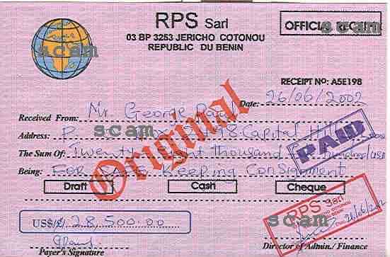 It was a day like any other, when... Miss Blessing Paul 20 July 2006 Dear One, It is my pleasure to acquaint you with this proposal for the purpose of investment in your company. I am Miss Blessing Paul the only daughter of late George Paul from Sierra Leone. My late father was a Gold and Diamond merchant based in Freetown Sierra-Leone. As a result of the political instability of Sierra-Leone, my late father came to Cotonou Benin republic with the sum of USD12,500,000.000(US$12.5m) which he deposited in a Financial and Security Institution here in Cotonou Benin Republic West Africa for security reasons I am here seeking for an avenue to transfer this money to a reliable and trustworthy individual for investment programmes. I am here as a refugee because of the political crisis in my Country Sierra Leone. Please I would offer you 20% of the total sum of USD12.5m for your assistance. Please I need to transfer this money urgently because delay would not help at all and I need to relocate based on the political instability in this sub-region, to enable me continue my education because i was medical student before the sudden of my father. Your immediate response would be appreciated. Best Regards Miss Blessing Paul. Pls:Do reply to my alternative direct email:blessing_p2@latinmail.com for more details. Bait the hook and cast... Malcolm Reynolds Dear Miss Paul, This sounds like a terrible situation. What happened to your family? My company hasn't yet been incorporated, so I don't really know if I can honestly suggest investment in it. I will help you all I can though. Let me know what I can do. Regards, Malcolm Reynolds Gotcha! The Ladette attaches a small pic of a young lady. Miss Blessing Paul 20 July 2006 Dear Malcolm Reynolds, I have read your reply to my letter to you requesting your co-operation with me in claiming and investing my funds overseas. I can understand you needed complete details or steps whereby you can proceed in handling this for me. Without wasting time due to my situation here at the moment, I will like you to know the requisition is as follows. 1. Like I did mention in my letter, the money has been carefully packaged during the time of depositing it in Royal Precious Security Company for safe keeping in a vault holding company in Benin by my late Father Mr. George Paul. 2. During the Crisis in my Country Sierra Leone i lost every body left alone,I was able to manipulate through United Nations peace keeping force to run into safety into Republic of Benin Refugee Camp. No one else is aware of this deposit and for this reason, I request your urgent move to claim the deposit and move the cash into your bank for any lucrative investments that will be fast growing. 3. It is well in they name of God my lawyer has promise to take all responsibility to secure all the legal claim documents, bearing your name as my foreign investor manager in position to put claim on the deposited consignment in your favour. 4. The only responsibility you will take is the Security Company Clearance fee to endorse the change of ownership to your name, from the Royal Precious Security Company for onward transfer of the said fund to your nominated bank account. 5. I need you to stand as a trustee to the deposit fund, also want you to secure a resident permit for me to come over to your country to further my education upon transfer is carry out to your bank account. If you are capable to handle this transcation confidential with me as you may know i am hiding my identity from the authorties for them not to confisicate my life inheritance back to Sierra Leone kindly furnish below information. a). Scan international passport or driver's license b). Contact address d). Bank details c). Private phone and Fax number d). Occupation 6. This information will used by lawyer to secure the claim documents from Ministry of Justice and High Court of Benin enabling you for the claim . 7. Enclose are my lawyer contact information's to enable you establish contact with him. Barrister Anthony Wells Telephone: +229-97-22-39-54 Fax: +229-21-31-88-10 Email:akwabachambers101@yahoo.com 8. Please sir do call my lawyer on receipt of this email I have discuss with him about you and he is waiting for your call, do let me know your discussion with him by email. 10. To facilitate the claim because I am willing to complete my study, as I was a medical student in my country before the war break out which lead to the killing of my family, present I am here in the Benin Refugee Camp all my hope depend on the deposit fund in custody of the Security company, please try and see what you can do fast to rescue me from the stress so that I will join you in your country to start new life once again. 11. Attached is my picture, in your next mail i will forward the Certificate of Deposit Receipt of payment During the time of deposit by my late father, AIC, and WILL Testament, please you should keep these documents secret until the consignment is release to you for my safety please, based on trust I am sending to you my life documents. My best wishes. Miss. Blessing Paul ![]() A slight hint on 'my' military past, and we're good to go. Malcolm Reynolds Dear Miss Paul, I'll do my best. As an ex-Marine, I'd offer nothing less. Just before I contact your lawyer - what's he like? Is there any topic that's off limits? Malcolm Reynolds Several bulky 'legal documents' arrive. Miss Blessing Paul 21 July 2006 Dear Malcolm Reynolds, Warm greeting to you Sir, I am sincerely grateful to your urgent response to my mail, like I did mention I have introduce you to my lawyer as my legal foreign investor manager in position to put claim on the deposit consignment on my behalf. My lawyer is very much convince to take the necessary step forward based on my discussion with him about, when contacting my lawyer I will please advice you to kindly address your letter to him instruct him to proceed towards the procurement of documentation on your behalf, there is noth
